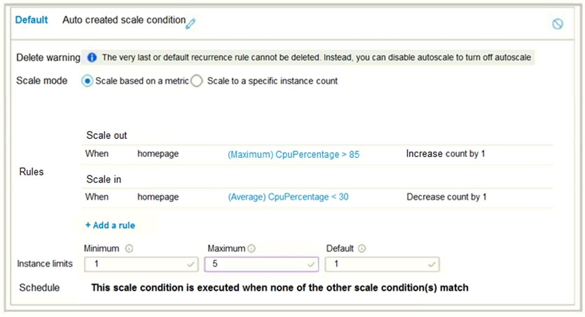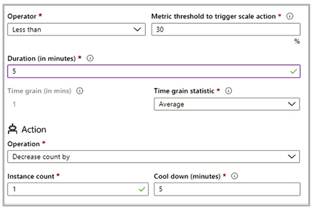 The scale-in settings for the App Service plan are configured as shown in the following exhibit.