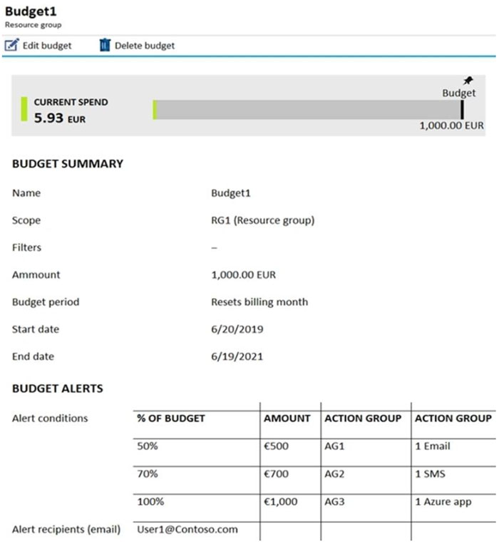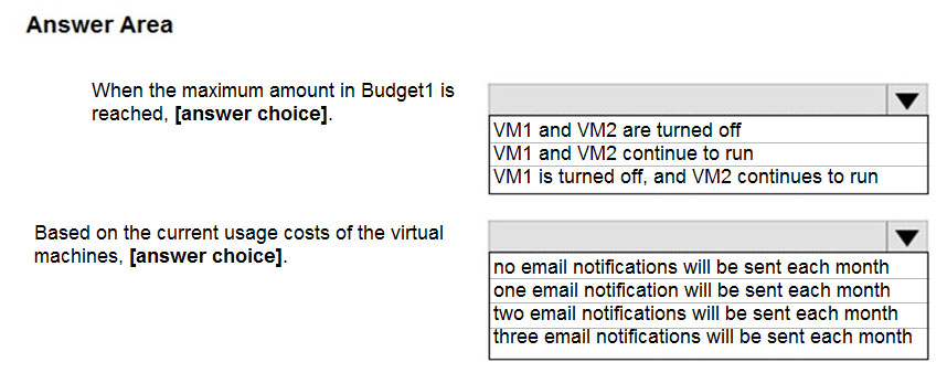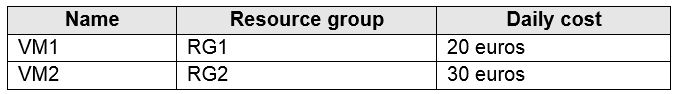 Budget alerts have scope in Resource Group RG1, which includes VM1, but not VM2.