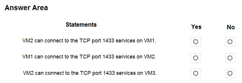VM1 has the NSG1 on Subnet1, which allows traffic over port 1433 between Subnet2 and Subnet1. But NSG2 also applied on NIC level for VM1 blocks the traffic on port 1433. Hence, no traffic is allowed. There is no priority bypass between NSGs. Traffic is filtered independently between NSGs.