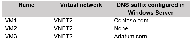 All three VMs are in VNET2. Auto registration is enabled for private Azure DNS zone named contoso.com, which is linked to VNET2. So, VM1, VM2 and VM3 will auto-register their host records to contoso.com.