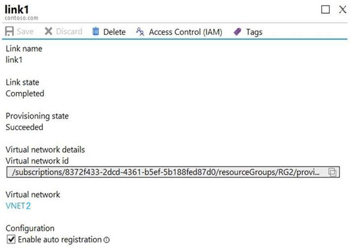 You create a virtual network link for contoso.com as shown in the following exhibit.