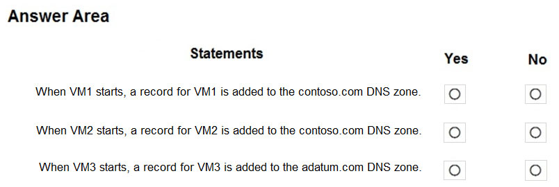 None of the VM will auto-register to the public Azure DNS zone named adatum.com. You cannot register private IPs on the internet (adatum.com)