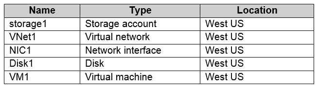 VM1 is running and connects to NIC1 and Disk1. NIC1 connects to VNET1.