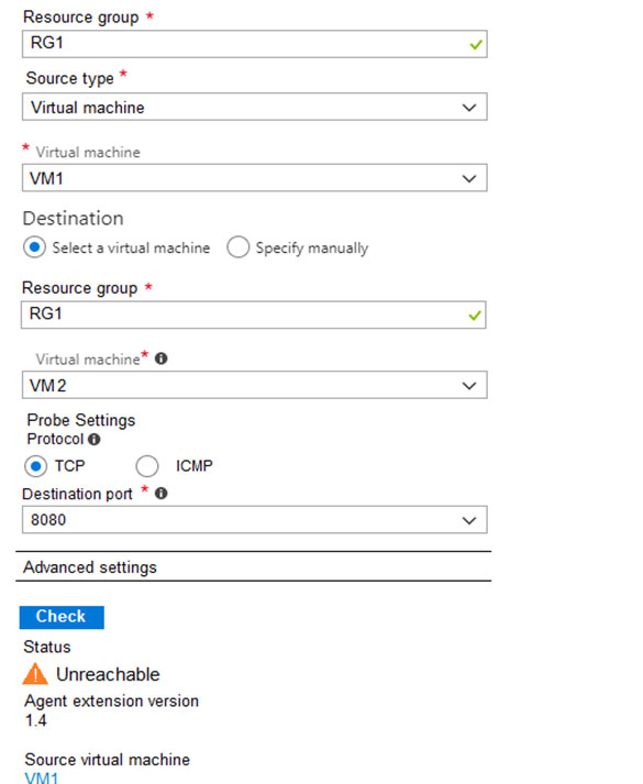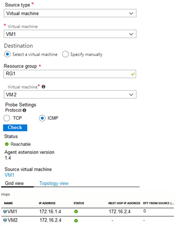 In Network Watcher, you can see that the next hop is the destination VM2. This means that they are part of the same virtual network.