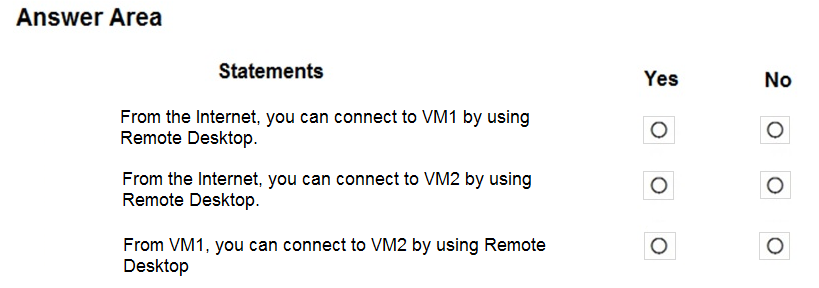 VM1 and VM2 use public IP addresses. From Windows Server 2019 on VM1 and VM2, you allow inbound Remote Desktop connections.