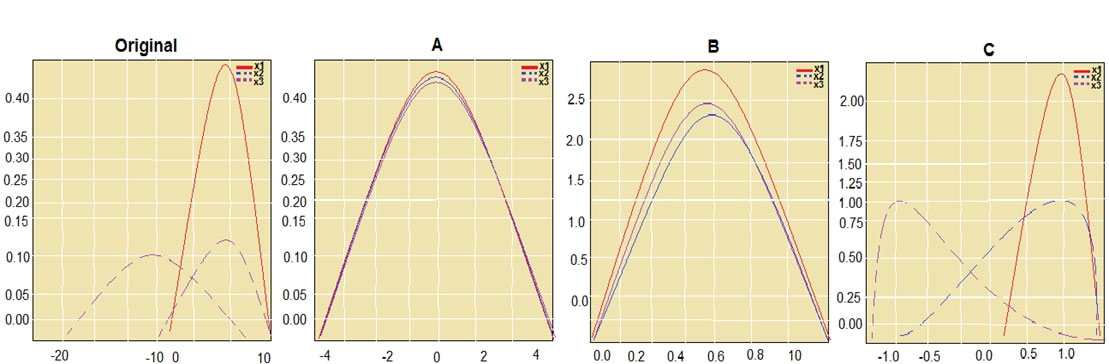Notice that the skewness of the distribution is maintained but the 3 distributions are brought into the same scale so that they overlap.