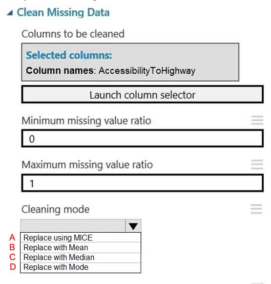 How should you configure the Clean Missing Data module? To answer, select the appropriate options in the answer area.