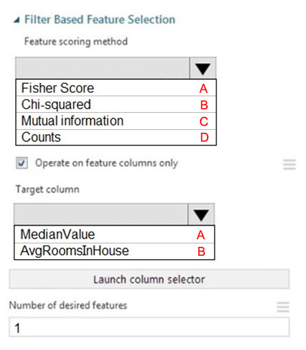Columns in each dataset contain missing and null values. The datasets also contain many outliers. The Age column has a high proportion of outliers. You need to remove the rows that have outliers in the Age column. The MedianValue and AvgRoomsInHouse columns both hold data in numeric format. You need to select a feature selection algorithm to analyze the relationship between the two columns in more detail.