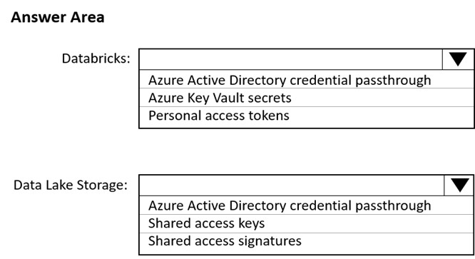 You need to recommend which authentication methods to use for Databricks and Data Lake Storage to provide the users with the appropriate access. The solution must minimize administrative effort and development