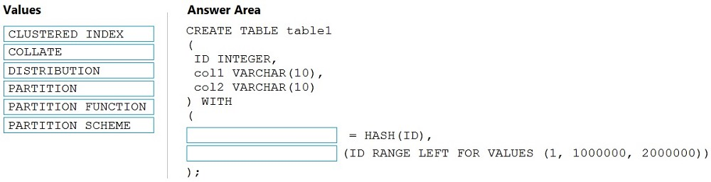 Table distribution options include DISTRIBUTION = HASH ( distribution_column_name ), assigns each row to one distribution by hashing the value stored in distribution_column_name.