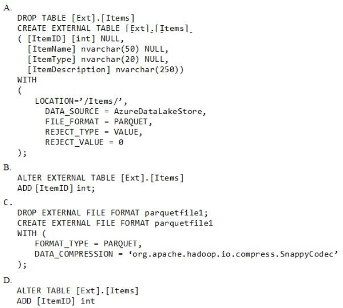 Using PolyBase, you CREATE table named [Ext].[Items] to query Parquet files stored in Azure Data Lake Storage Gen2 without importing the data to the data warehouse.