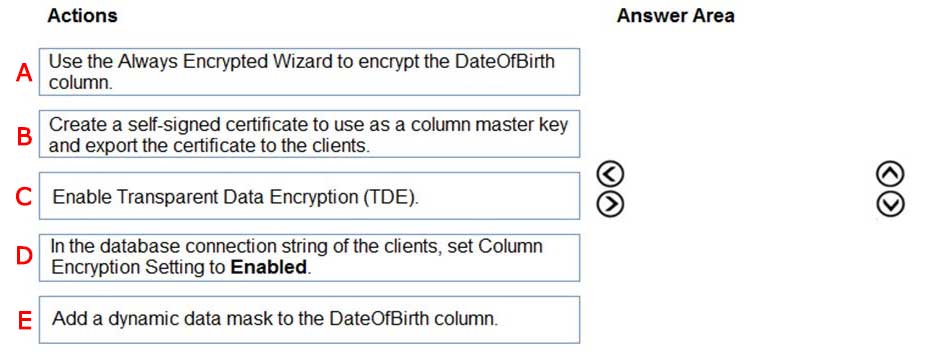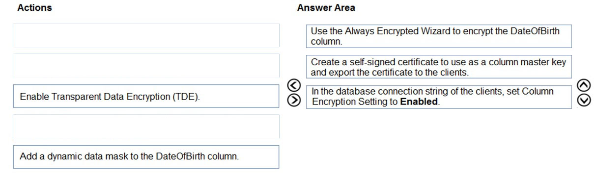 You need to ensure that the data in the DateOfBirth column is encrypted both in the database and when transmitted between a client and Azure. Only authorized clients must be able to view the data in the column.
