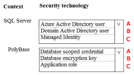 Scenario: Allow Contoso users to use PolyBase in an Azure Synapse Analytics dedicated SQL pool to query the content of the data records that host the Twitter feeds. Data must be protected by using row-level security (RLS). The users must be authenticated by using their own Azure AD credentials.