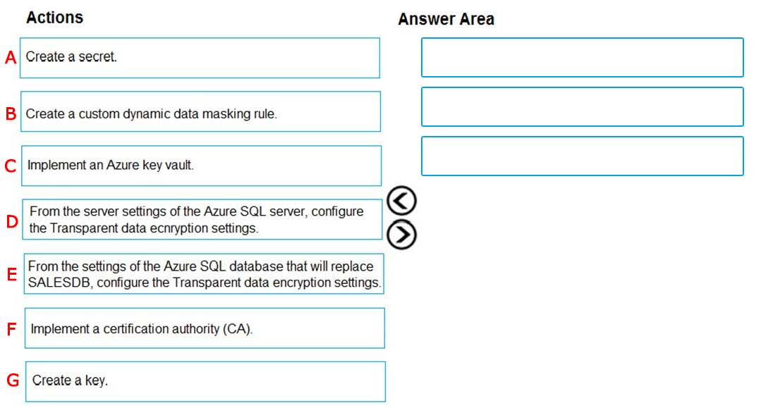 Data in SALESDB must encrypted by using Transparent Data Encryption (TDE). The encryption must use your own key.