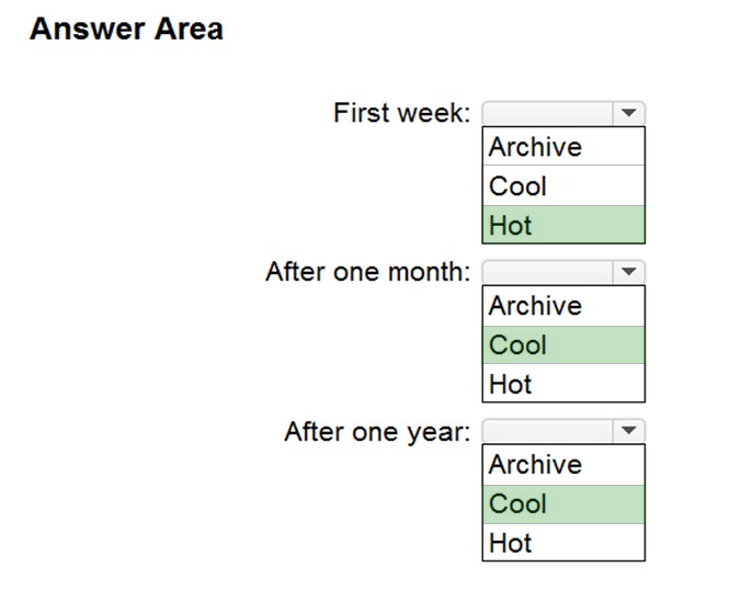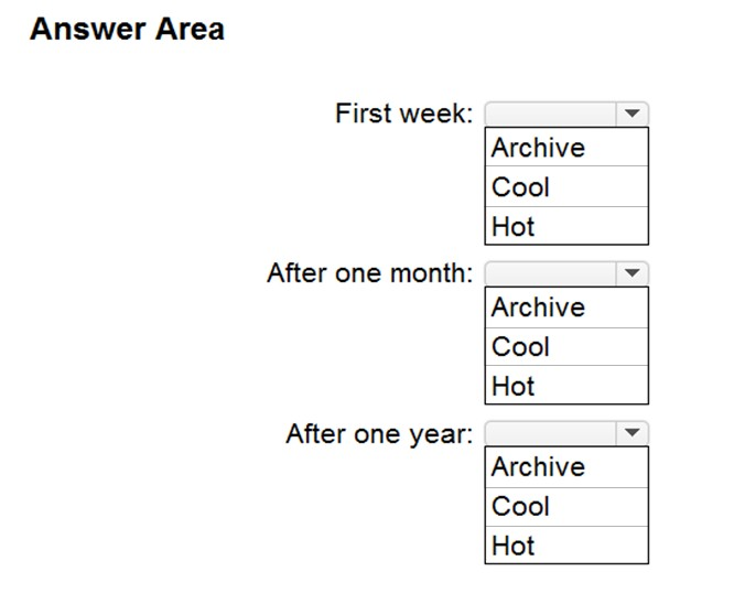 When the data is first created, the data will be accessed frequently during the first week. After one month, the data must be accessible within 30 seconds, but files will be accessed infrequently. After one year, the data will be accessed infrequently but must be accessible within five minutes.