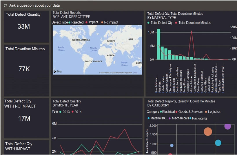 - A KPI visual that shows the current daily percentage of defective products manufactured.