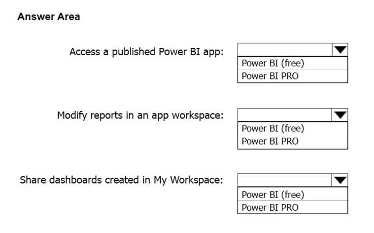 You need to identify which Power BI licenses are required for the tasks. The solution must use the Power BI (free) license, whenever possible.
