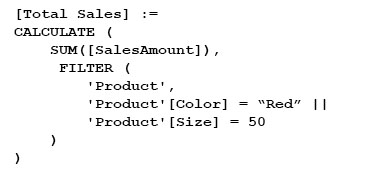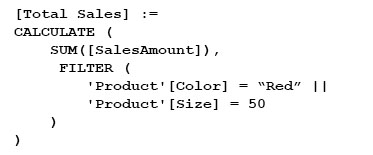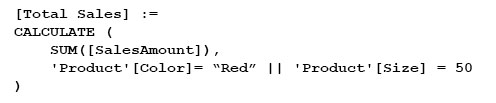 You need to create a measure of Sales[SalesAmount] where Product[Color] is Red or Product[Size] is 50.