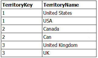 You add another table named Territory to the model. A sample of the data is shown in the following table.