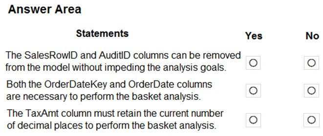 You are creating a Microsoft Power BI imported data model to perform basket analysis. The goal of the analysis is to identify which products are usually bought together in the same transaction across and within sales territories.